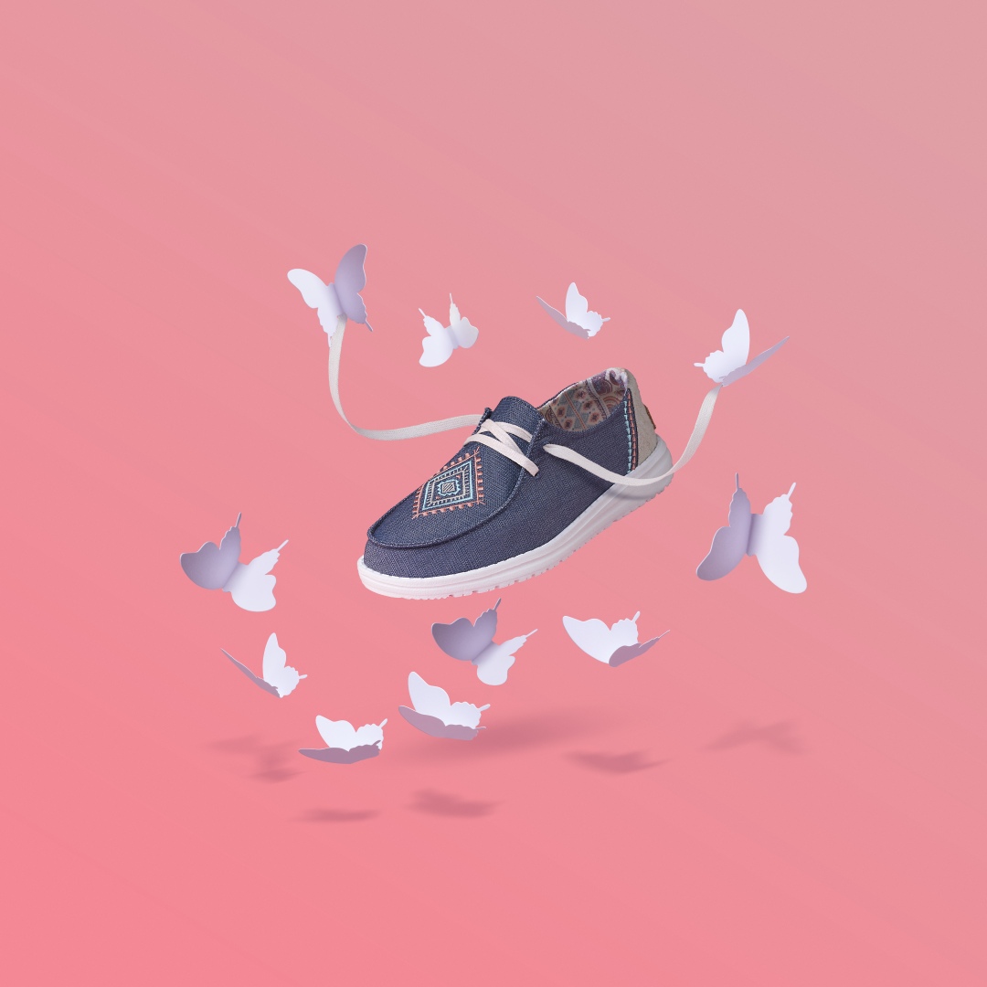 Our strategy for Meta Ads was to focus campaigns around Brand Awareness and Engagement, promoting HEY DUDE’s shoes with eye-catching, creative content that highlighted their comfort and style. Imaginative visuals, such as shoes being carried by butterflies or supported by futuristic paper structures, intended to create buzz around the brand, especially in Germany, where the company had less recognition. These innovative visuals helped draw attention and engagement.