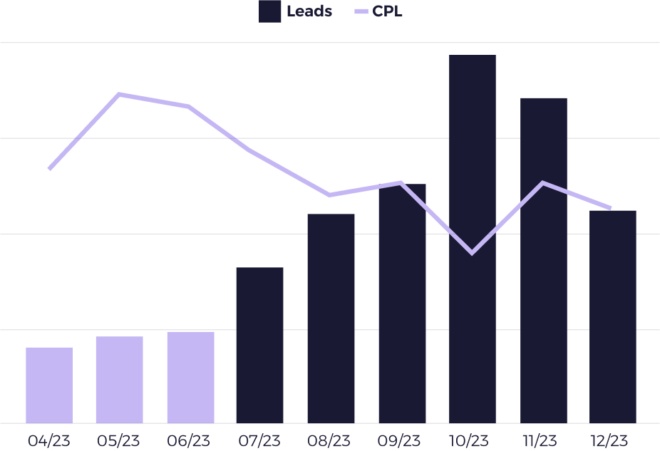 - Innerhalb von gerade einmal fünf Monaten reduzierten unsere Maßnahmen die Kosten pro Lead (CPL) um nahezu 42 Prozent und übertrafen die ursprünglichen Lead-Ziele deutlich.